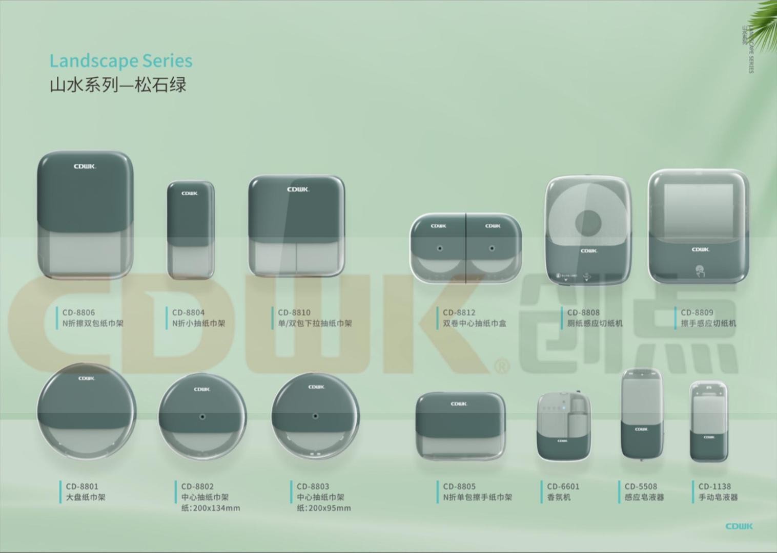 山水系列主打環(huán)保理念,崇尚清雅、純凈和自然的設(shè)計美學(xué),以材質(zhì)與肌理抒敘美感,達到“以意構(gòu)境、以意造型、以意生色”天人合一的狀態(tài)。目前,該系列有鉆石白和松石綠兩種顏色,包括了大盤紙巾盒、雙卷紙巾盒、擦手紙巾盒、皂液器、感應(yīng)切紙機、智能香氛機等產(chǎn)品。設(shè)計上以人為本,選擇極簡、留白的設(shè)計語言,使用更少的元素,采用雙色拼接,以新潮極簡的設(shè)計美學(xué)傳遞美好生活方式,同時使得產(chǎn)品呈現(xiàn)出細(xì)膩光滑的質(zhì)感,擁有流暢的線條,極盡演繹簡約輕盈的美學(xué)造詣,塑造沉穩(wěn)亦靈動的空間氣質(zhì)。