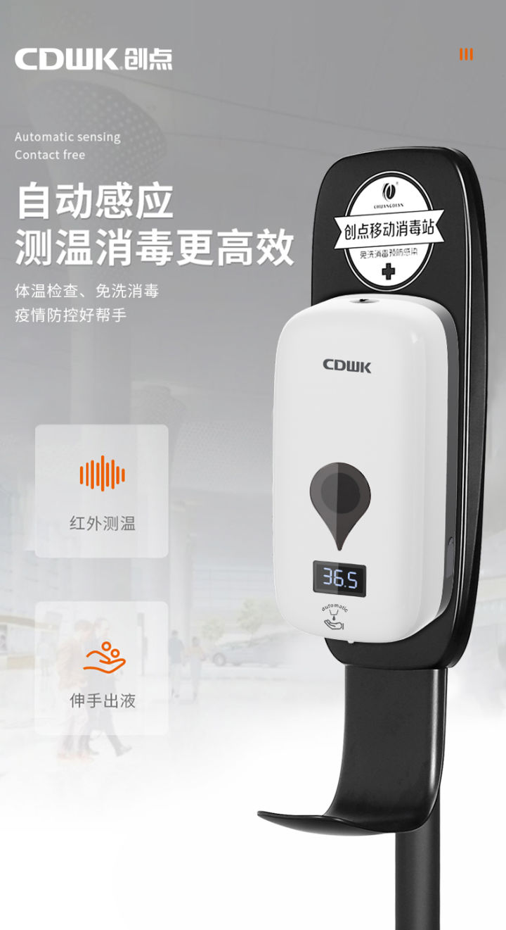 其移動消毒站專為解決公共場所健康監(jiān)測、清潔消毒難題而來。整體外形基于簡約美學而開發(fā),黑白干凈的配色,讓整體機身給使用者帶來更加清爽整潔的視覺感受,更加融合了它極簡的設(shè)計理念。產(chǎn)品設(shè)置了紅外線傳感器,用戶把手放置感應(yīng)區(qū)域,皂液器就可自動出泡,降低了可能傳播細菌和病毒的風險,衛(wèi)生又干凈,打造看得見的安全感,同時能有效控制浪費現(xiàn)象,實現(xiàn)便捷測溫,滿足酒店業(yè)高效、便捷、節(jié)能的衛(wèi)生清潔需求。