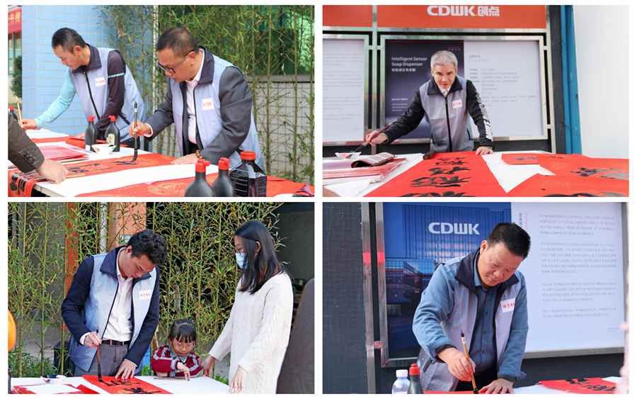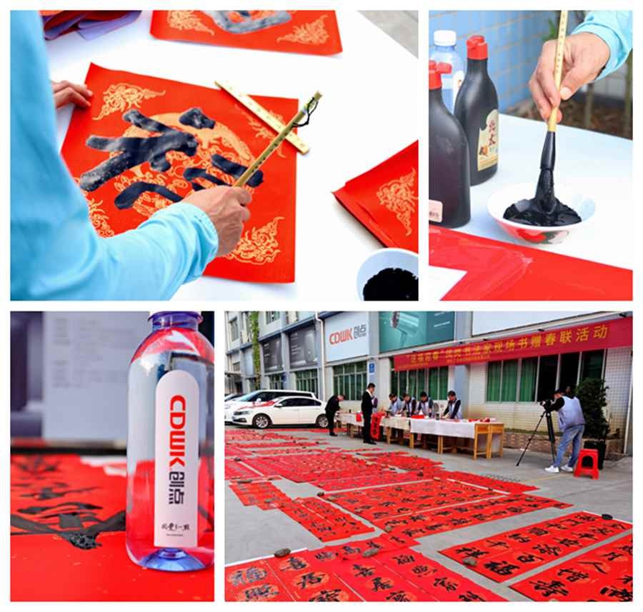 儒韻雅風(fēng)展成果,筆歌墨舞留清香。鳳崗書(shū)協(xié)老師們現(xiàn)場(chǎng)揮灑豪墨,場(chǎng)面可謂壯觀,且氣勢(shì)磅礴。地面紅彤彤一片,都是書(shū)協(xié)老師們揮毫的春聯(lián)。CDWK創(chuàng)點(diǎn)與鳳崗書(shū)協(xié)的交流活動(dòng),無(wú)疑是與書(shū)法文化有機(jī)融合,同時(shí)也為弘揚(yáng)鳳崗企業(yè)文化和書(shū)法文化搭建了一個(gè)良好的平臺(tái)。